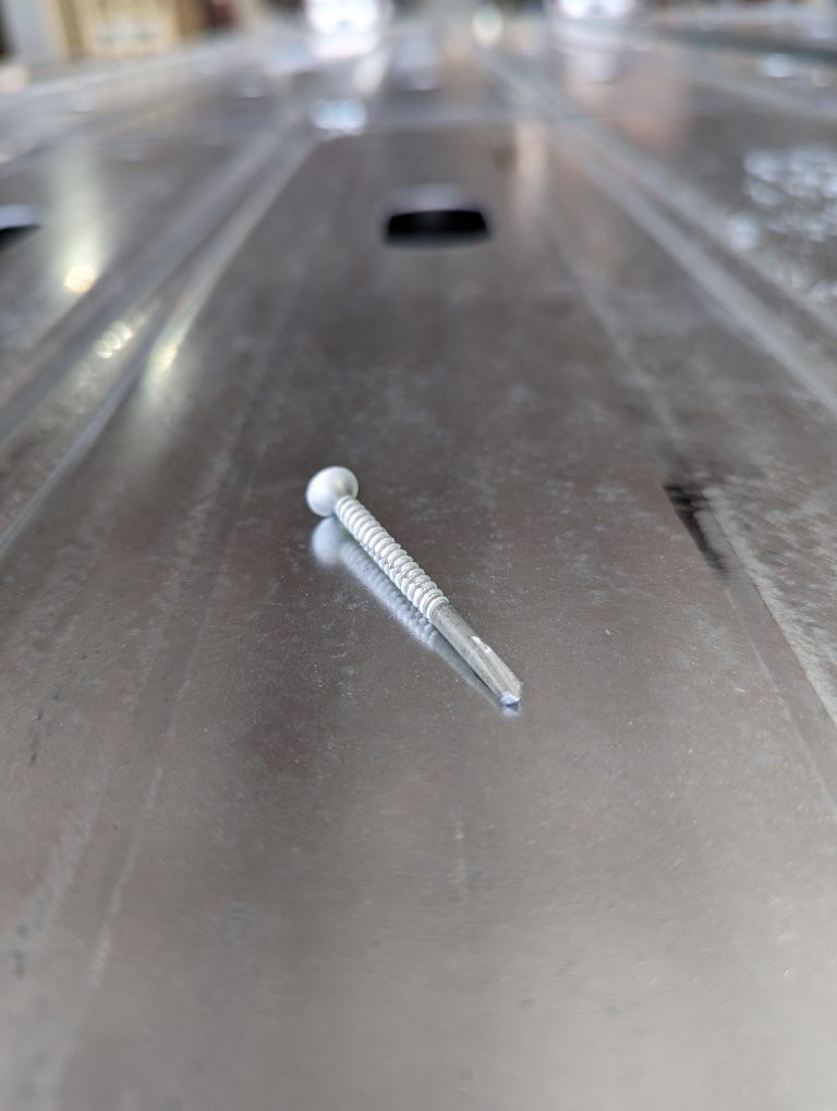 The Pilot Point Self-Drill Fastener by Kratos (Zeus) is designed to secure 3/4" plywood to 20-14 gauge metal studs. The coarse thread enhances the screw's stability by providing increased holding power in wood. Its self-drilling point eliminates the need for pilot holes.